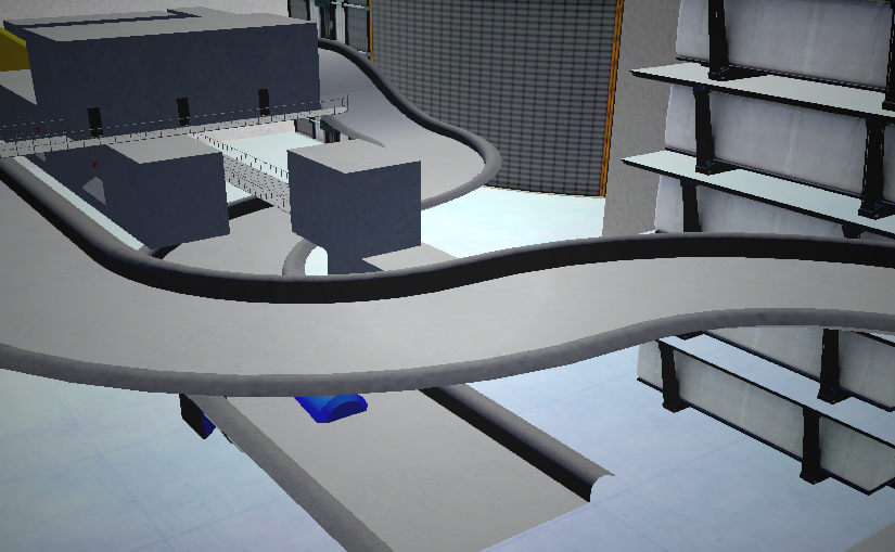 This is a futuristic indoor city with catwalks and metal houses and boxes with lights on them and stuff- it's cool, alright?